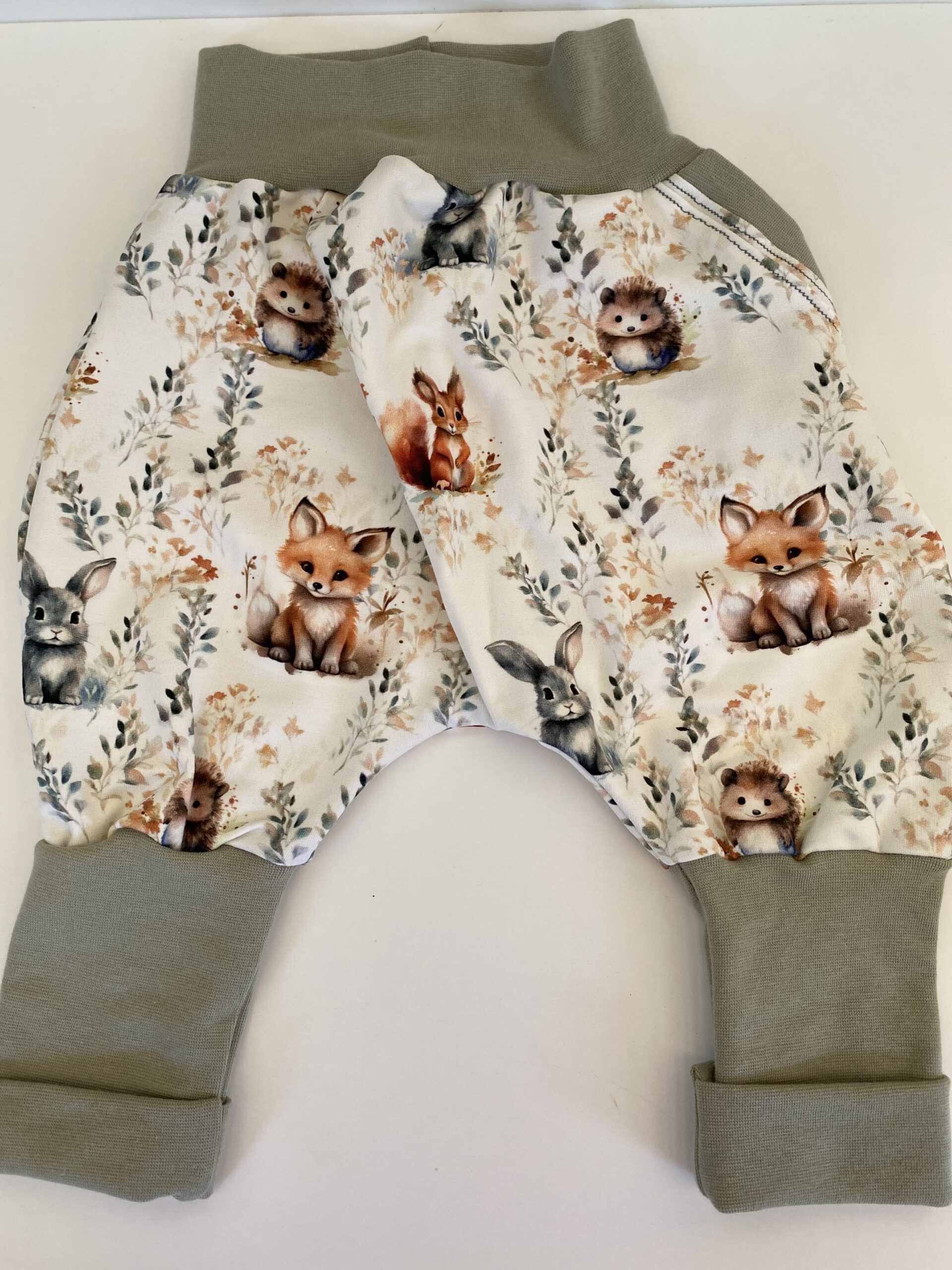 Diese süße Pumphose ist ein echter Hingucker! Der hochwertige Jersey-Stoff ist weich, elastisch und angenehm auf der Haut – perfekt für die empfindliche Kinderhaut. Das liebevoll gestaltete Tiermuster mit Fuchs, Hase und Igel verleiht der Hose einen verspielten, natürlichen Look.