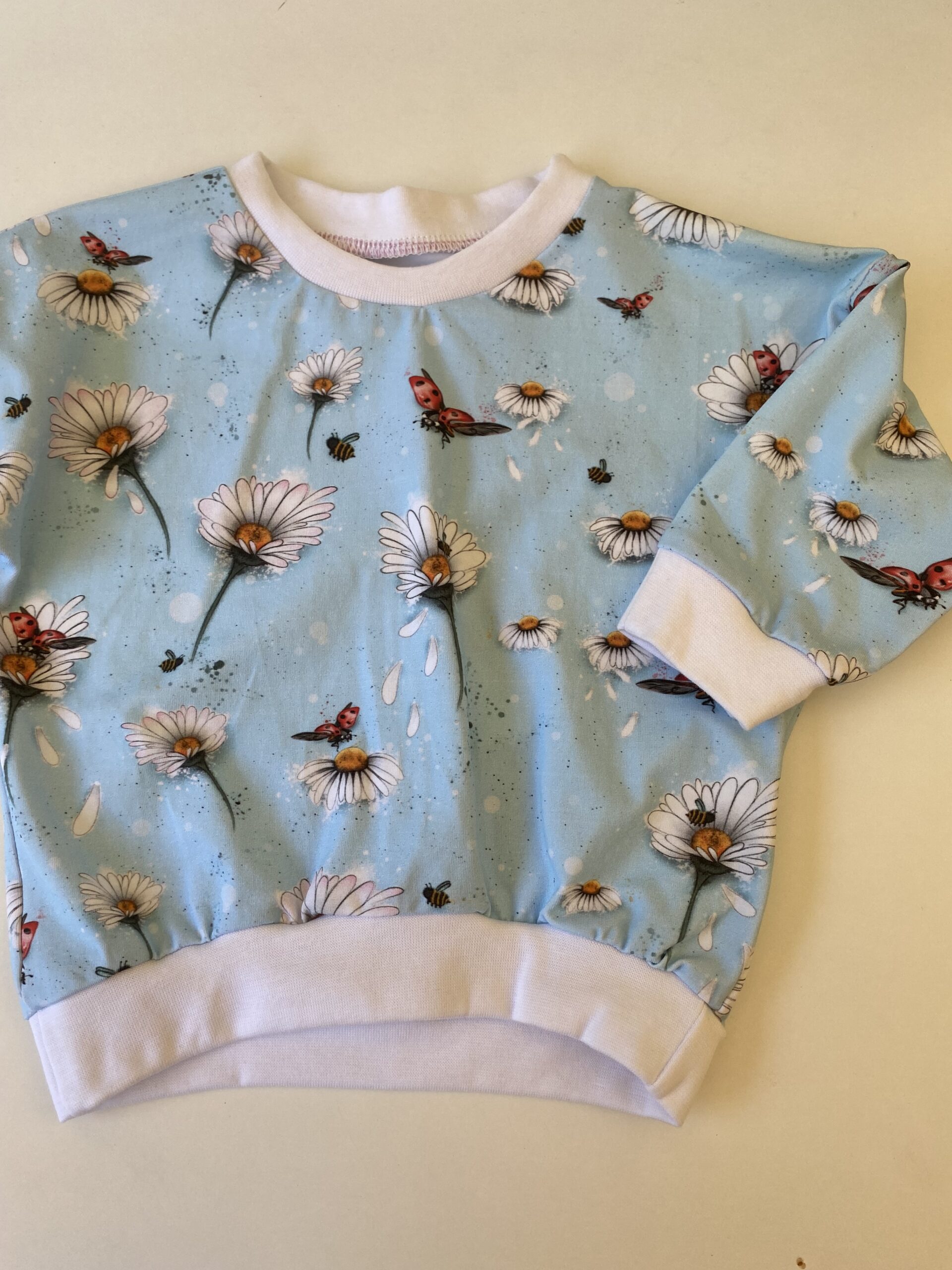 Oversize Kinderpullover „Gänseblümchen & Käfer“ – Größe 74